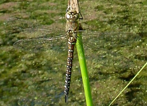 ÉmergenceLe cycle larvaire de l'Aeschne mixte est très court, sept à neuf mois en moyenne. Les larves ne passent qu'un seul hiver dans l'eau, grandissent rapidement et muent onze fois. |
