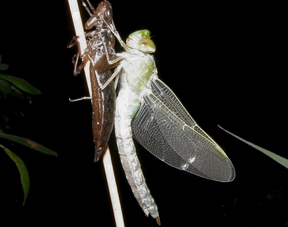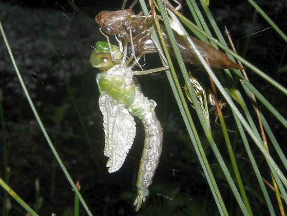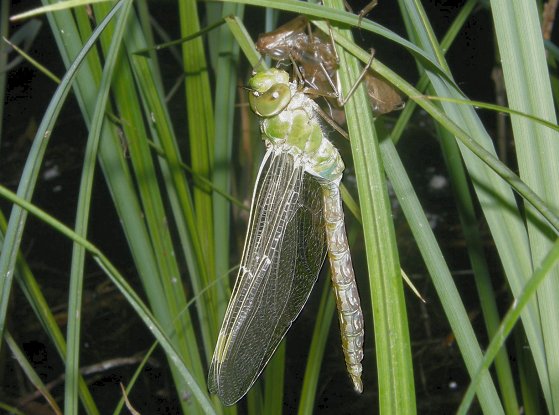 Anax imperator, EmergenceLes émergences de l'Anax empereur (Anax imperator) ont lieu de nuit le plus souvent. La mue imaginale dure plusieurs heures et ne se termine qu'au lever du jour. Les larves peuvent choisir n'importe quel type de support, plante ou branche morte, et s'éloigner du bord de l'eau, même si la plupart se contentent de grimper le long des tiges des plantes dont les racines sont immergées. |
