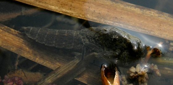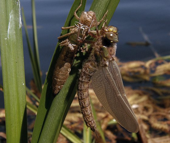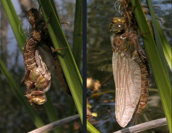 Brachytron pratense, EmergenceLes larves de l'Aeschne printanière (Brachytron pratense) sortent de l'eau en matinée et grimpent à quelques dizaines de centimètres du sol. Elles ne s'éloignent pas du bord de l'eau. Elles sont grandes (quatre centimètres de long), sombres et peu marquées. Elles ont de petits yeux caractéristiques. Les imagos en mue imaginale sont très colorés et leur aspect varie peu au cours de l'émergence. Seuls les mâles se colorent ensuite en bleu. |
