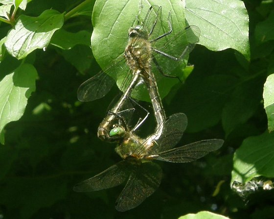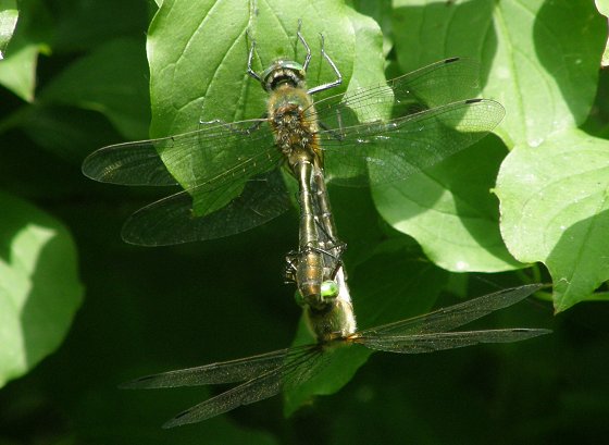 Cordulia aenea, AccouplementLes cordulies bronzées se perchent volontiers en hauteur pendant l'accouplement. Le tandem ne vole pas sur de longues distances et se pose régulièrement s'il doit se déplacer. Les cordulies bronzées ne sont pas présentes en grand nombre au parc de Brieux, et peu de mâles non appariés risquent de venir perturber la fécondation de la femelle lors d'un accouplement. |