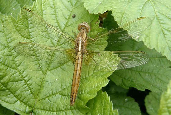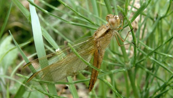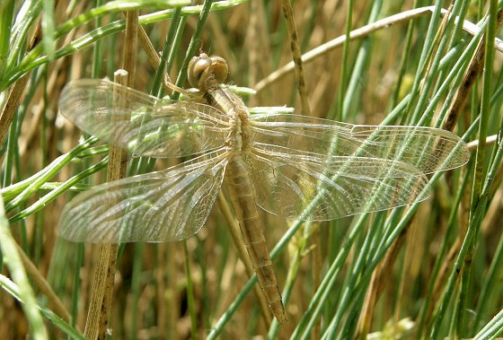 Crocothemis erythraea, ImmaturesLes libellules écarlates (Crocothemis erythraea) immatures sont jaunâtres et peu marquées sur le dessus de l'abdomen. Les bandes antéhumérales blanches soulignées de noir sur le thorax permettent par contre d'identifier l'espèce très rapidement. Les yeux sont teintés de gris dès la fin de l'émergence. Les ptérostigmas sont jaunes. |