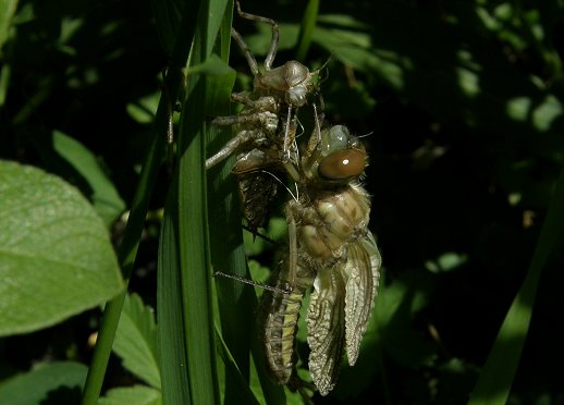 ÉmergenceLes oeufs de la Cordulie à deux taches éclosent plusieurs semaines après la ponte. Les larves passent trois ans dans l'eau. Lors de l'émergence, elles sortent le matin et ne s'eloignent guère du bord de l'eau. Elles ne grimpent pas très haut sur la végétation ou restent au sol. |