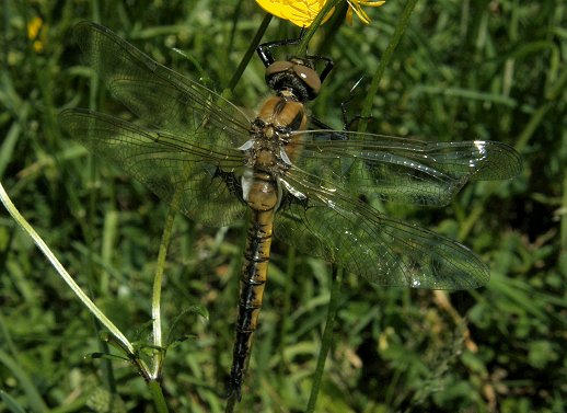 Identification des imagos maturesIl est rare de pouvoir observer la Cordulie à deux taches de près car elle passe son temps en vol au-dessus de l'eau, à bonne distance des berges. De la taille d'une aeschne (un peu plus de 6 cm de long), elle est brune et noire avec deux grandes taches noires à la base des ailes postérieures. Les femelles présentent un abdomen plus épais que celui des mâles, mais les deux se ressemblent beacoup. Les appendices anaux sont divergents chez les mâles, droits et parallèles chez les femelles. Les ailes sont légèrement fumées sur leur bordure antérieure. |