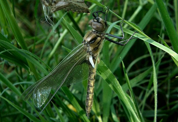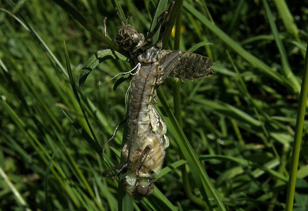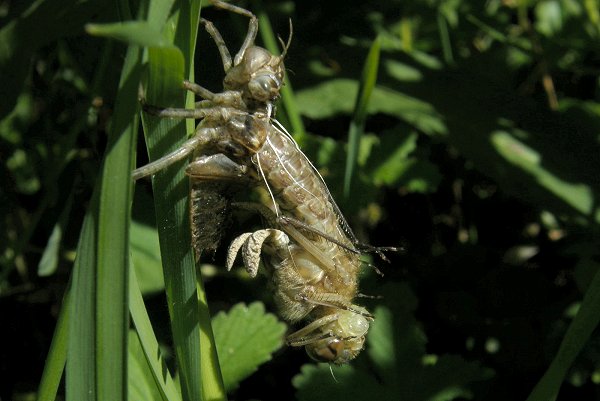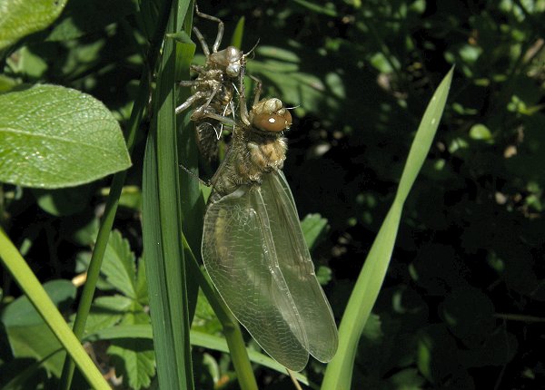 Epitheca bimaculata, EmergenceLors de l'émergence les larves de la Cordulie à deux taches (Epitheca bimaculata) sortent de l'eau le matin et peuvent s'éloigner des berges. Elles ne grimpent en général pas très haut sur les plantes. La durée de la mue imaginale est de plusieurs heures. Les imagos sont brunâtres avec le dessus de l'abdomen teinté de jaune. Les bandes et marques noires du thorax et de l'abdomen apparaissent tardivement. |