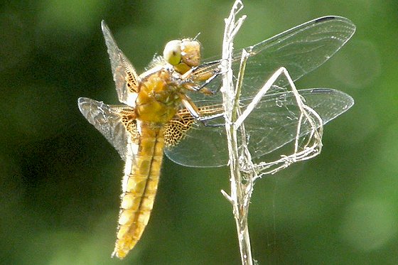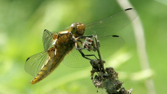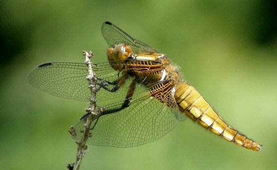 Libellula depressa, Femelles immaturesLes très jeunes femelles de Libellule déprimée (Libellula depressa) présentent un abdomen très jaune qui ne deviendra verdâtre qu'à maturité. Le thorax est brun-roux et les yeux sont verts. L'écartement des appendices anaux permet de les distinguer des mâles immatures qui leur ressemblent beaucoup. |