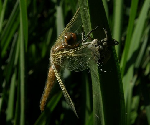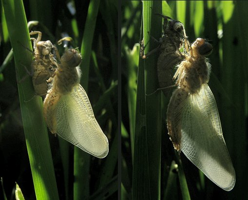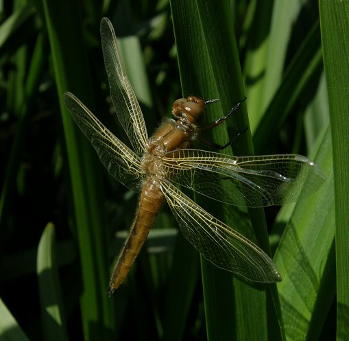 Libellula fulva, EmergenceLes libellules fauves sont jaunâtres à l'émergence puis adoptent une coloration orangée. Thorax et abdomen sont peu marqués. Les émergences ont lieu en début de matinée, et les larves grimpent assez haut, s'éloignant peu de l'eau. Les très jeunes imagos venant d'émerger sont volants avant de présenter les taches noires à la base des ailes, mais les nervures jaunes apparaissent très vite. |