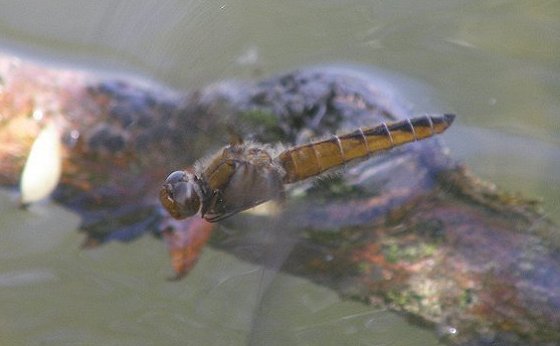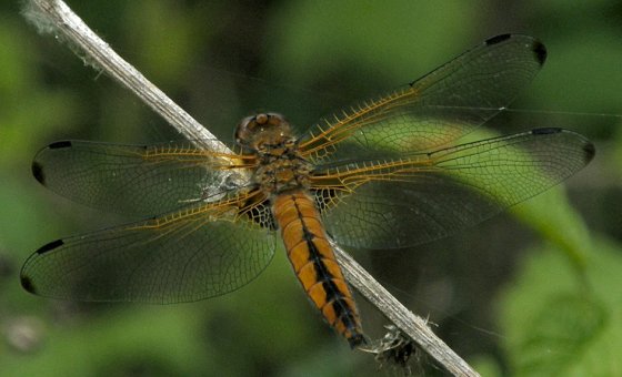 Libellula fulva, Femelles maturesLes libellules fauves (Libellula fulva) femelles ont un abdomen orange marqué de noir et des taches noires à l'apex des ailes. La coloration orange est vive chez les jeunes femelles matures, et plus terne, brun foncé, lorsqu'elles sont plus âgées. Les yeux sont gris. |