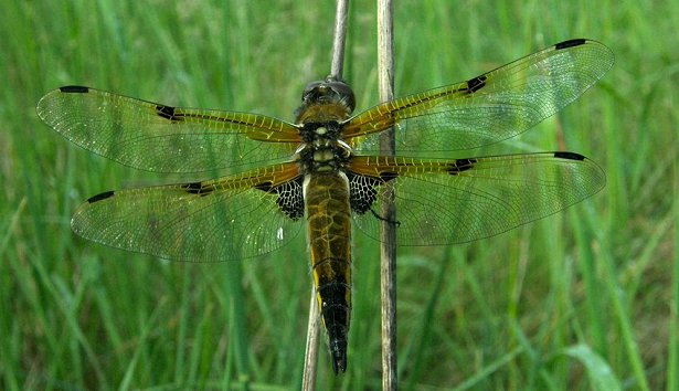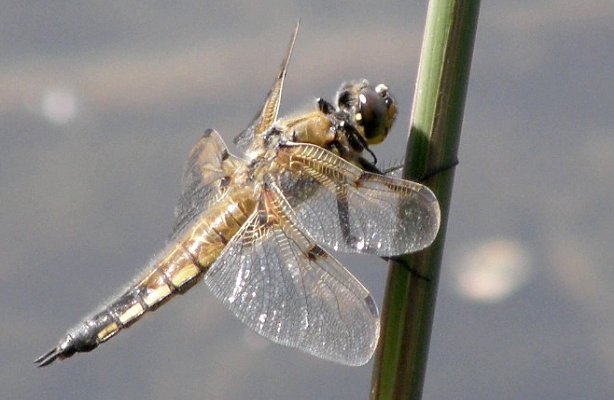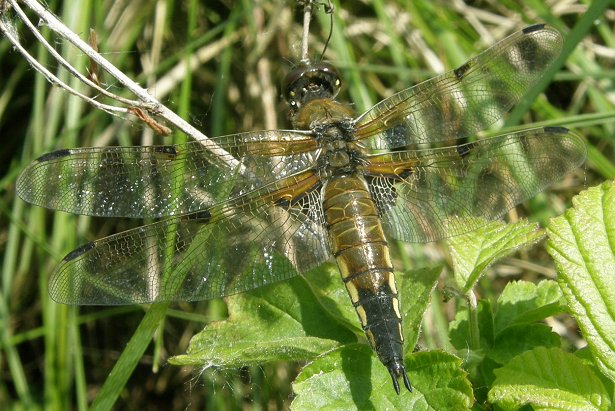 Libellula quadrimaculata, Femelles maturesLes libellules à quatre taches (Libellula quadrimaculata) femelles sont plus claires que les mâles et leur abdomen est légèrement plus large. Le meilleur critère pour les distinguer des jeunes mâles reste cependant l'écartement des appendices anaux. Ils sont droits et parallèles chez les femelles, et divergents chez les mâles. |