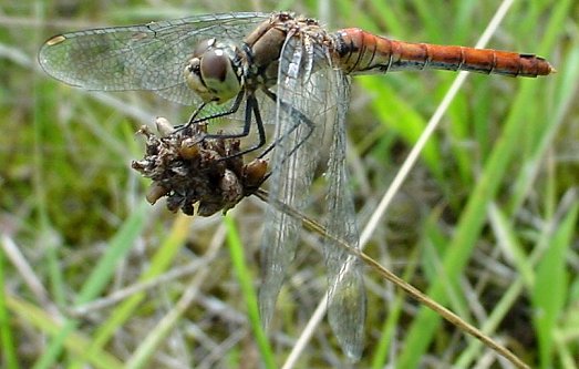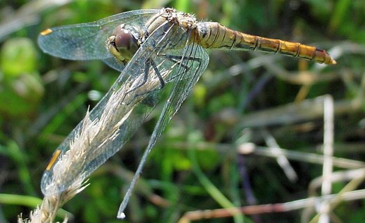 Sympetrum sanguineum, ImmaturesLes sympétrums sanguins immatures sont tout d'abord jaunâtres et peu marqués puis prennent une coloration plus orangée. Les pattes sont noires et la face présente une ligne noire qui descend le long des yeux. |