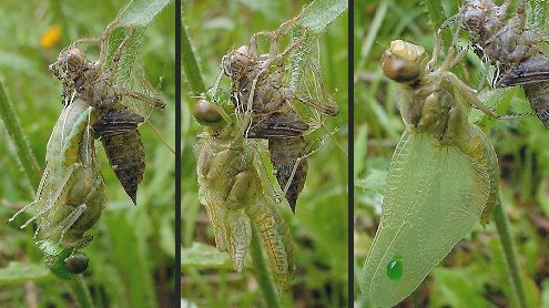 ÉmergenceAprès avoir passé l'hiver ou jusqu'à 3 ou 4 années à grandir et à se transformer progressivement, les larves sortent de l'eau pour subir la dernière transformation de leur vie, celle qui va leur donner la possibilité de voler et de se reproduire. La plupart des espèces choisissent un endroit ensoleillé sur la berge, qu'elles rejoignent au matin. Elles ne s'éloignent guère du bord de l'eau et grimpent à faible hauteur sur une plante, une branche ou une roche où elles s'immobilisent en position verticale, tête en haut. Après plusieurs minutes, la peau se fend au niveau du thorax et l'imago commence à s'extraire de son enveloppe de chitine. L'émergence est une période critique pour l'imago qui est particulièrement vulnérable. Il doit attendre plusieurs heures avant que ses ailes ne soient suffisamment rigides pour tenter un premier vol, souvent hésitant et de courte durée. |