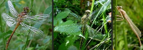 Photos : de gauche à droite, imagos immatures, Sympétrum strié (Sympetrum striolatum) mâle, Orthétrum réticulé (Orthetrum cancellatum) femelle, Agrion à larges pattes (Platycnemis pennipes) mâle. |