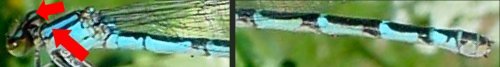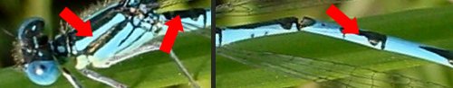Photos : chez les agrions femelles matures, la coloration peut être bleue ou verte et le dessin des marques noires ne constitue pas un critère fiable. Il est souvent nécessaire de vérifier les bandes antéhumérales, les taches postoculaires et la forme ou le dessin du pronotum. La présence d'une épine vulvaire permet également d'identifier une espèce. |