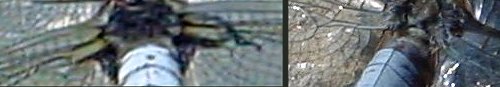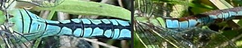 Photos : l'identification des aeschnes nécessite d'observer le thorax, notamment les bandes latérales et les bandes antéhumérales. Chez certaines espèces, la forme des taches sur l'abdomen est également caractéristique. |