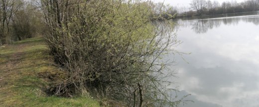 Photos : les jeunes arbres et buissons commençant à reverdir en bordure des étangs début avril. Les peupliers noirs, les saules et les aulnes ont encore très peu de feuillage. |
