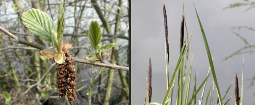 Photos : à gauche, nouvelles feuilles d'aulne. À droite, début de la floraison des carex dont les nouvelles feuilles sont encore courtes. |