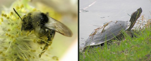 Photos : à gauche, petite abeille des sables butinant sur les chatons de Saule marsault. À droite, les quelques grandes tortues de Floride du parc de Brieux recommencent à sortir de l'eau pour prendre le soleil mi-avril. |
