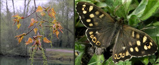 Photos : à gauche, nouvelles feuilles de peuplier noir la troisième semaine d'avril. À droite, le Tircis commence à réapparaître le long des haies. |
