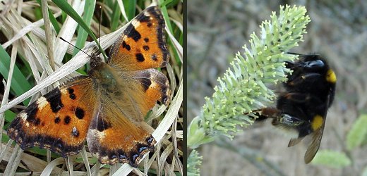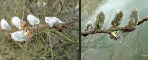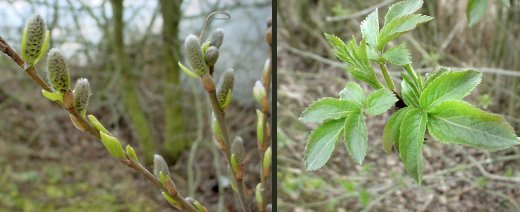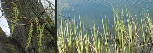 Photos : à gauche, chatons et bourgeons de Peuplier noir mi-mars. À droite, jeunes pousses de carex fin mars. |