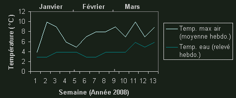 Le mois de mars s'annonce maussade et pluvieux. Le ciel reste couvert en fin de semaine 9 et pendant toute la semaine 10. Les températures de l'air baissent légèrement à nouveau. la température de l'eau reste stable à 4°C. La semaine 11 se termine avec une hausse sensible des températures. L'eau passe à 6°C et les insectes aquatiques sont de retour. La mi-mars marque également le réveil des grenouilles vertes et l'apparition des premiers papillons (Paon du jour et Grande Tortue) au parc de Brieux. La semaine 12 est également très pluvieuse avec de rares apparitions du soleil. Les températures baissent à nouveau. La semaine 13 marque le retour du soleil après un début particulièrement froid. L'eau remonte à 6°C. |