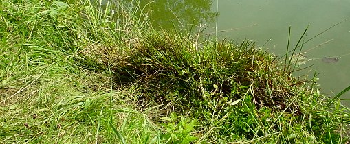 Photo : Végétation rivulaire (joncs) dégradée en période de reproduction des odonates. Les plantes sont coupées en de nombreux endroits le long des étangs en été pour faciliter la pêche. |