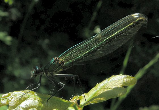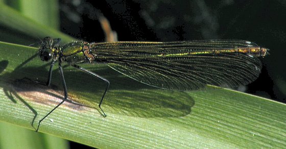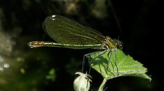 Calopteryx splendens, Femelles maturesLes femelles du Caloptéryx éclatant (Calopteryx splendens) sont vertes à reflets bronze et les deux premières sutures thoraciques sont noires. La coloration verte de leurs ailes évite souvent les confusions avec d'autres espèces du genre Calopteryx mais dans certains cas, lorsque plusieurs espèces sont présentes, l'identification à vue est presque impossible. |
