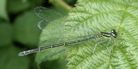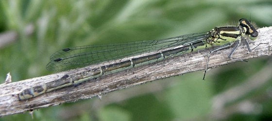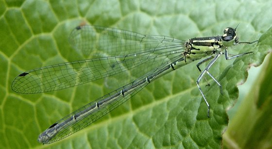 Coenagrion puella, Femelles maturesLes femelles de l'Agrion jouvencelle (Coenagrion puella) se présentent sous deux formes, verte ou bleue. La forme verte est de loin la plus commune au parc de Brieux. Sur la forme verte, le dessus de l'abdomen est uniformément noir. Les deux ou trois derniers segments abdominaux peuvent être teintés de bleu. Les taches postoculaires peuvent être séparées ou reliées par une fine ligne verte. Les ptérostigmas sont noirs et en forme de losange. La bordure arrière du pronotum, entre la tête et le thorax, est arrondie. Elle ne présente pas de "dent" centrale comme chez l'Agrion exclamatif. |