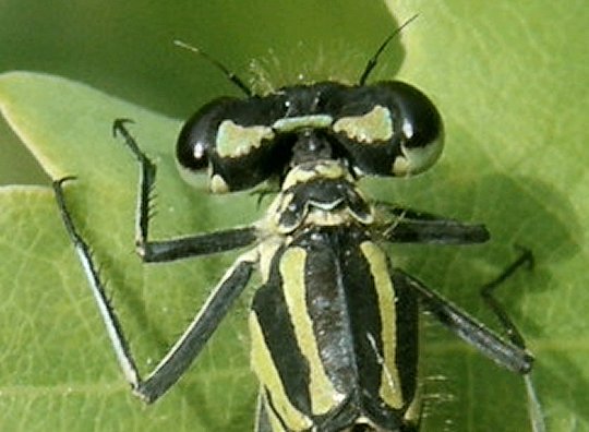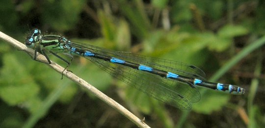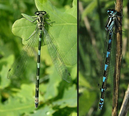 Coenagrion pulchellum, Femelles maturesLes femelles de l'Agrion exclamatif (Coenagrion pulchellum) peuvent se présenter sous trois formes principales : bleue, verte ou bicolore (bleue et verte). Le dessin sur le second segment abdominal ainsi que les autres marques sont également variables. Le risque de confusion avec les femelles de l'Agrion jouvencelle (Coenagrion puella) en forme bleue est grand. Il est souvent nécessaire de vérifier la forme de la bordure postérieure du pronotum, en "W" chez Coenagrion pulchellum, pour identifier l'espèce. |