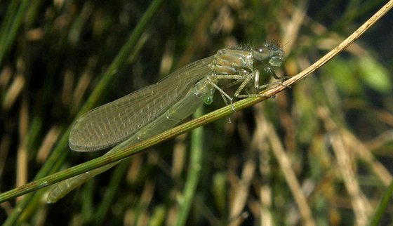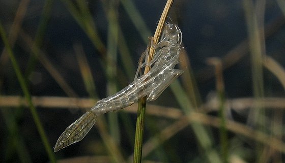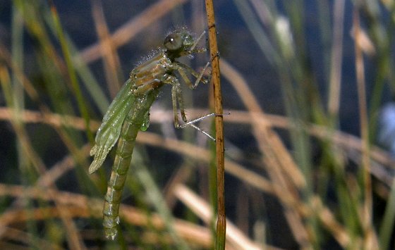 Les agrions porte-coupe (Enallagma cyathigerum) sont verdâtres à l'émergence. Leur thorax se colore rapidement en brun mais l'abdomen reste vert translucide. L'émergence est très rapide et les jeunes imagos sont volants avant même d'avoir adopté la coloration beige uniforme des immatures.