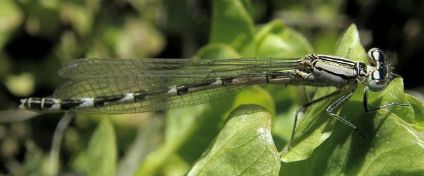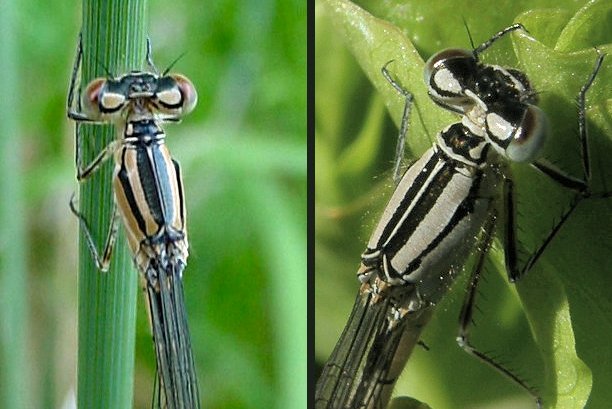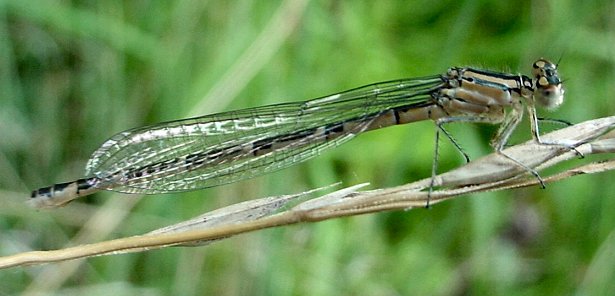 Enallagma cyathigerum, Femelles immaturesLes femelles immatures de l'Agrion porte-coupe (Enallagma cyathigerum) sont beiges à l'émergence et se colorent progressivement en vert. À ce stade elles peuvent rester vertes (forme verte) ou se colorer en bleu (forme bleue). Une phase intermédiaire entre le vert et le bleu dure queqlues jours chez les jeunes femelles de forme bleue. |