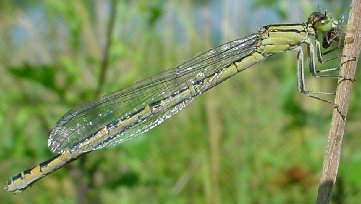 Enallagma cyathigerum, Femelles maturesLes femelles matures de l'Agrion porte-coupe (Enallagma cyathigerum) peuvent être bleues ou vertes (forme terne). Elles ressemblent beaucoup aux femelles des espèces du genre Coenagrion mais s'en distinguent par l'épine vulvaire en amont de l'ovipositeur. |