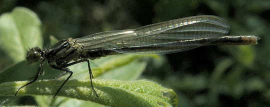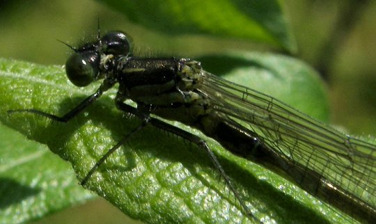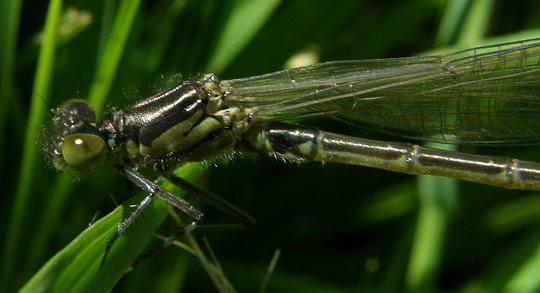 Les très jeunes mâles Erythromma najas sont méconnaissables. Verts et peu marqués de noir sur l'abdomen, ils sont faciles à confondre avec d'autres agrions. Une fine bande antéhumérale est parfois visible et peut prêter à confusion. La marque noire sur les côtés du second segment abdominal doit être vérifiée. |