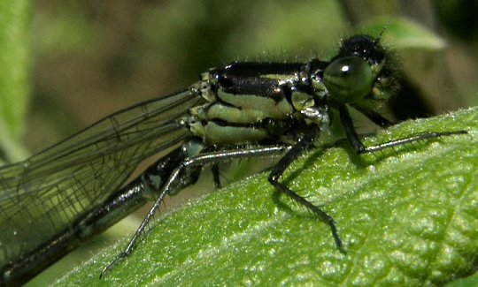 Erythromma najas, Mâles immaturesLes naïades aux yeux rouges mâles immatures sont verts à l'envol. La coloration en bleu sur le second segment abdominal et à l'apex de l'abdomen est très discrète. Les yeux ne se colorent en rouge que tardivement. |