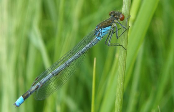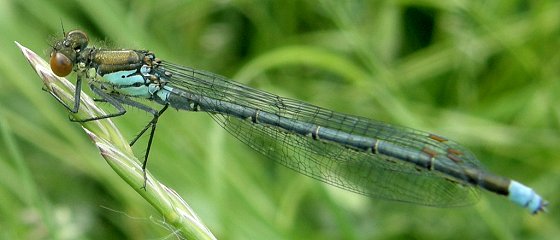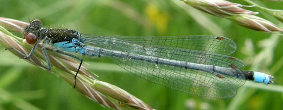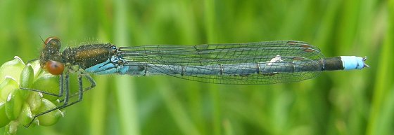 Erythromma najas, Mâles maturesLes naïades aux yeux rouges mâles matures sont un abdomen gris-noir et un thorax uniformément sombre, sans bandes antéhumérales visibles. Les côtés du second segment abdominal sont majoritairement noirs, avec très peu de bleu. Le dernier segment abdominal, juste avant les appendices anaux, est bleu, sans marque noire. |