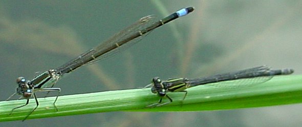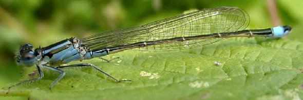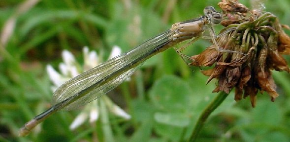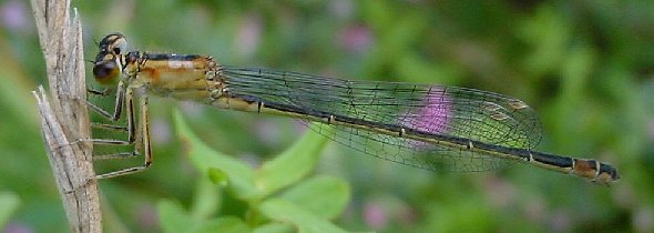 Ischnura elegans, Femelles immaturesLes femelles immatures de l'Agrion élégant (Ischnura elegans) peuvent se présenter sous deux formes : violette ou rose. Les immatures violettes deviennent bleues (andromorphes) ou vertes à maturité. Les immatures roses deviennent ternes (vertes à bandes antéhumérales brunes) à maturité. |