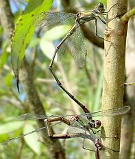 Photo : couple de lestes verts en ponte sur une branche de saule. |